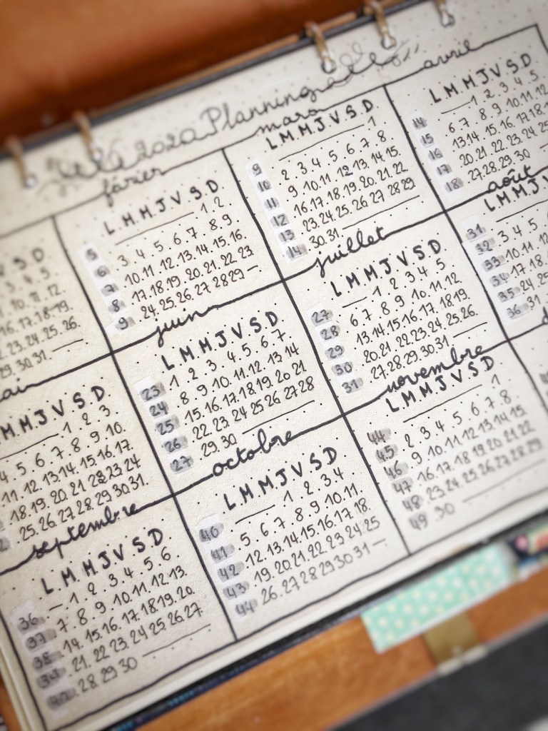 J’avance dans la préparation de mon bullet-journal. Voici mon planning 2020, j’ai mis tous les mois sur la même page pour avoir un œil direct sur tous les mois. J’ai ajouté le numéro des semaines pour le côté pratique ! Je ne vais rien écrire dessus, il me servira juste de base et de visuel pour l’année 2020.