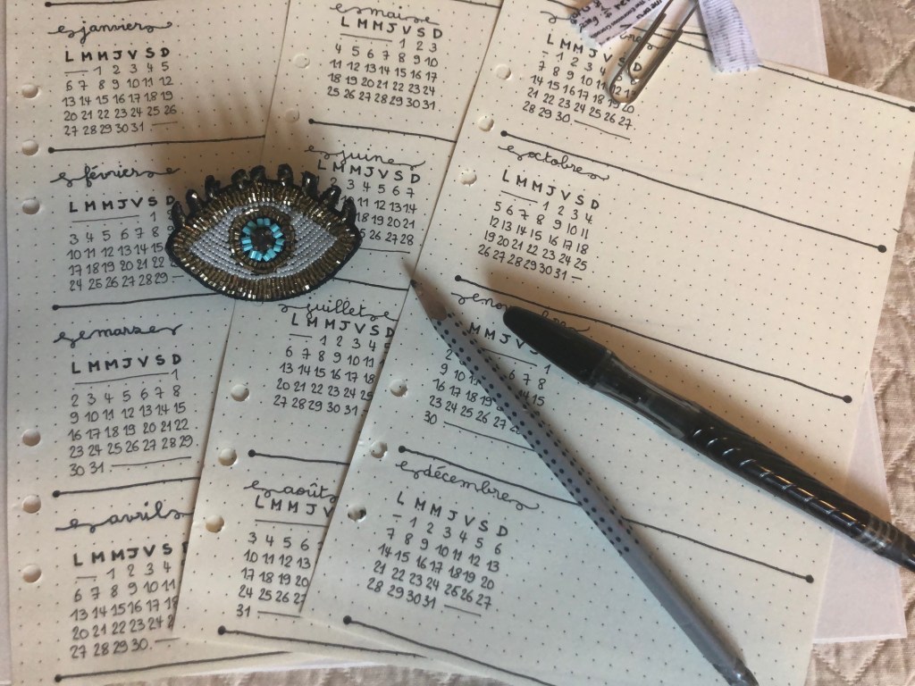 Je continue l’organisation de mon Bullet Journal et, pour ce faire, j’ai préparé trois pages importantes. Ce sont les Future Log, globalement, c’est une façon de lister mois par mois, les moments forts d’une année. On les code par catégories avec diverses couleurs sur les mini-calendriers et on écrit les détails sur le côté.