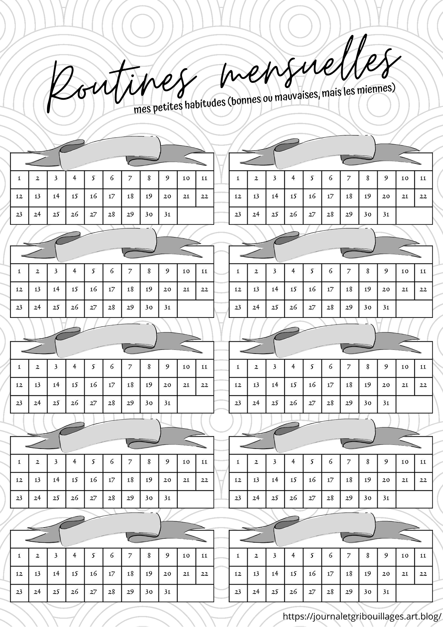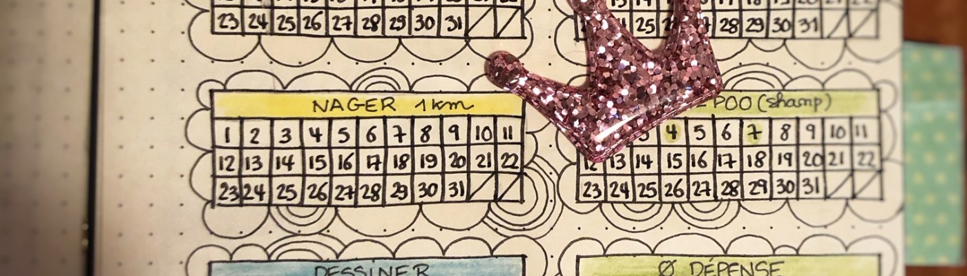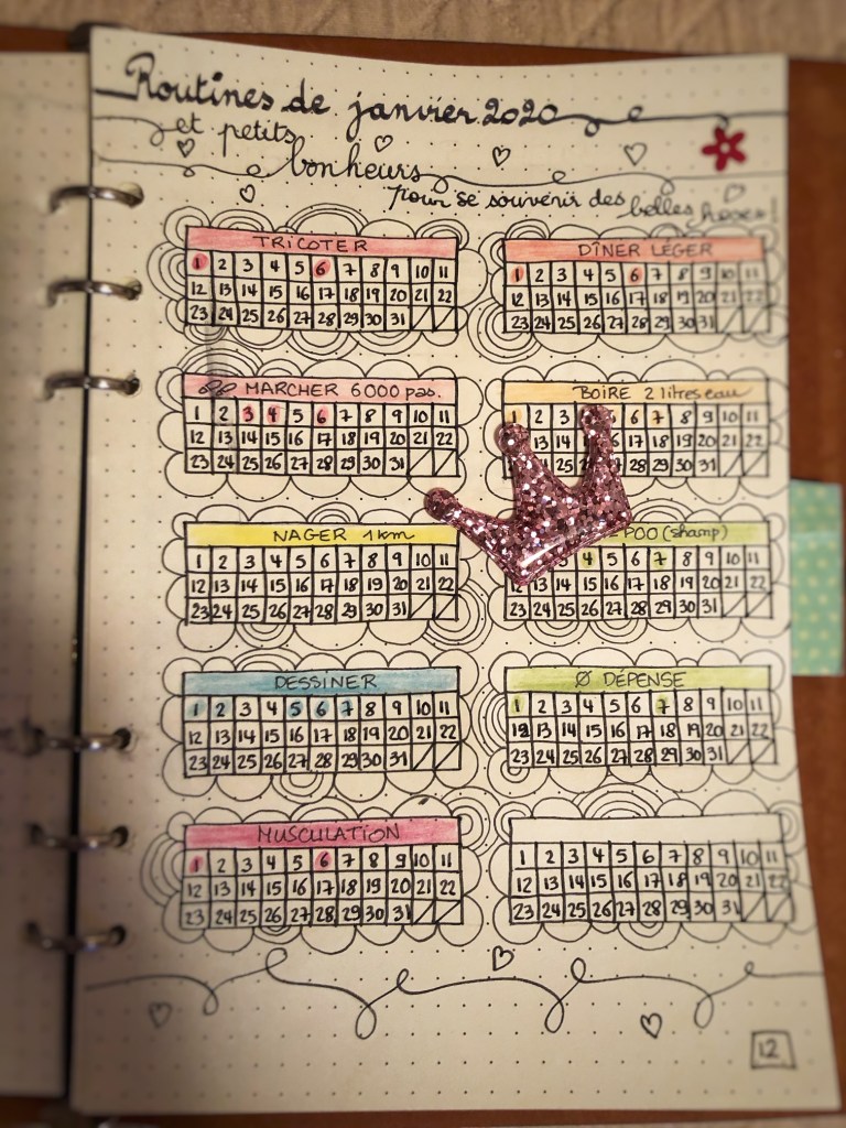 J’ai donc pris en compte un truc que j’ai adoré : les trackers. C’est un concept super rigolo qui consiste à noter les bonnes ou mauvaises habitudes, les petites routines ou rituels du quotidien ou hebdomadaires. Pour ma part, ça va du low-poo (shampoing sans produit chimique) aux deux litres d’eau à boire en passant par les 6 000 pas quotidiens …