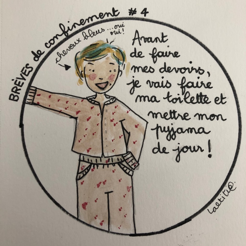 Mais le top du top du truc super cool de ce confinement, c’est qu’on peut être en pyjama toute la journée et c’est trop trop bien dixit Mlle Linette !!! Alors, comme on essaie de garder un semblant de « normal » dans ces moments « anormaux » : le matin, on enfile le pyjama « jour » et le soir, le pyjama « nuit ».